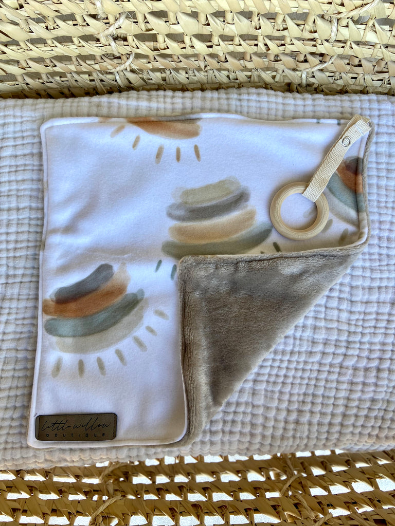 This handmade, super soft lovey, or also known as security blanket is perfect for little ones! The front print is fleece fabric that is very soft, fade resistant and shows colors very beautifully & vibrant. The back part is minky fabric which is so soft making it the best accessory for your baby to cuddle with. It also has a snapped loop making it great for attaching a pacifier, toys and teethers, The lovey can also be attached to the stroller preventing it to fall on the ground.