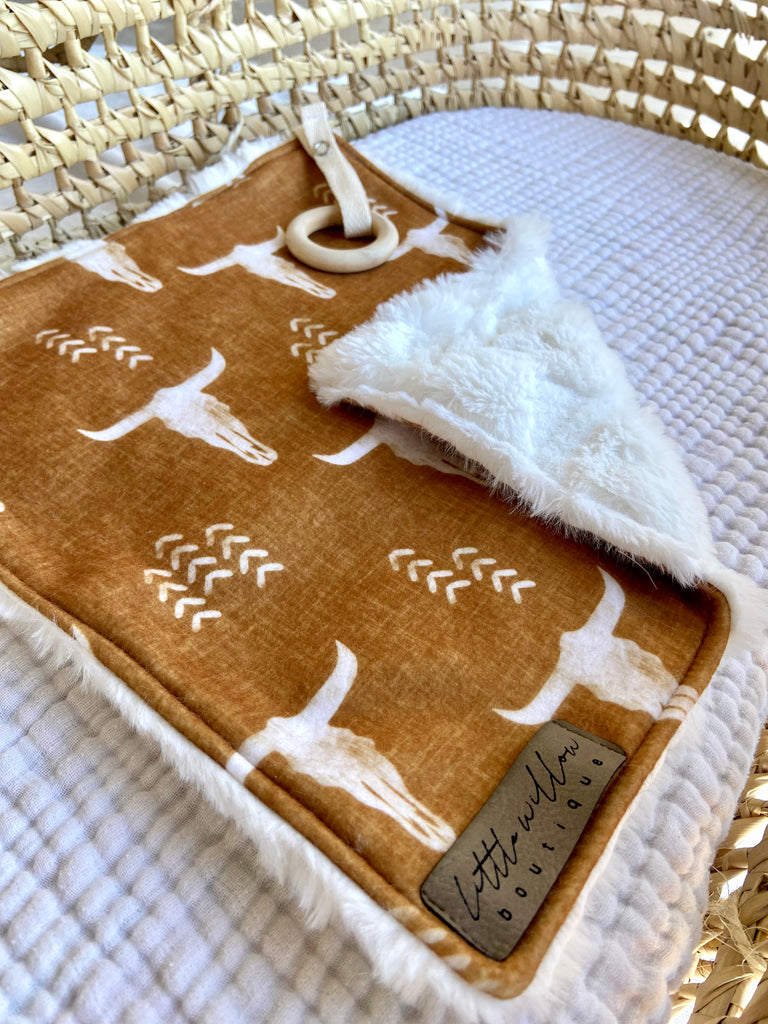 This Lovey is is approx. 10 x 10in. Perfect size for baby to carry around, snuggle and keep in the diaper bag. It also makes a great baby shower gift!
